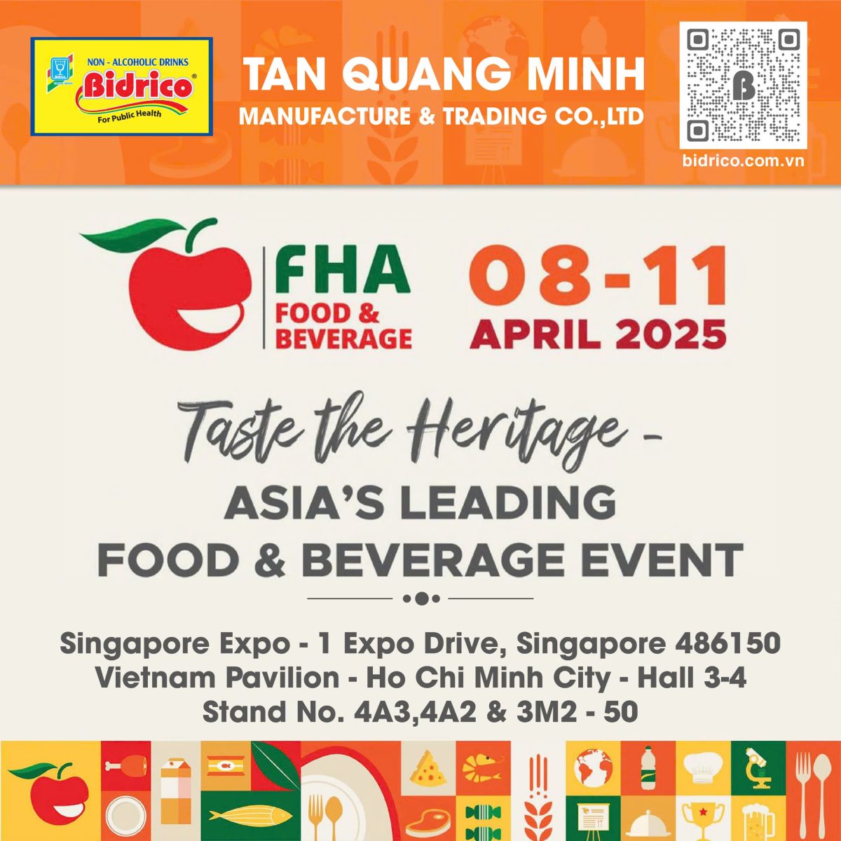 Từ ngày 8 đến 11 tháng 4 năm 2025, Công ty TNHH SX & TM Tân Quang Minh – Bidrico chính thức góp mặt tại FHA-Food & Beverage 2025, triển lãm thực phẩm và đồ uống lớn nhất châu Á tổ chức tại Singapore Expo – nơi quy tụ hơn 1.500 nhà triển lãm từ hơn 50 quốc gia, đón tiếp trên 65.000 khách tham quan chuyên ngành. Đây không chỉ là một sự kiện toàn cầu, mà còn là nơi kết nối các xu hướng F&B xanh, sạch và bền vững trong thời đại tiêu dùng thông minh.