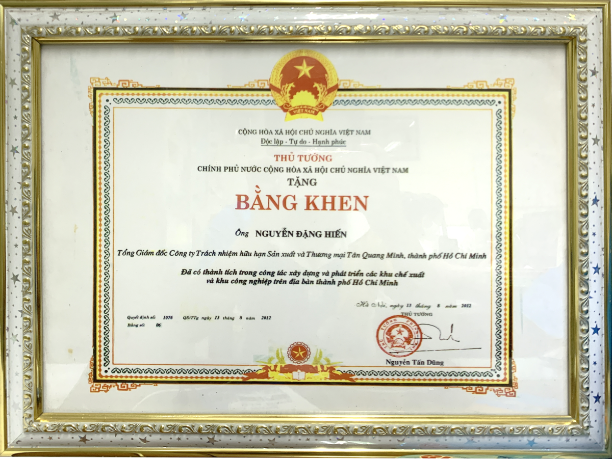 Thủ tướng chính phủ Nước Cộng Hòa Xã Hội Chủ Nghĩa Việt Nam – Nguyễn Tấn Dũng đã trao tặng bằng khen cho Ông Nguyễn Đặng Hiến – Tổng Giám Đốc Công ty Nước giải khát Tân Quang Minh (BIDRICO) vì “đã có thành tích trong công tác xây dựng và phát triển các khu chế xuất, khu công nghiệp trên địa bàn thành phố Hồ Chí Minh” vào ngày 13/8/2012. Đây là một vinh dự lớn không chỉ đối với Tổng Giám Đốc mà còn là vinh dự chung của tập thể cán bộ công nhân viên của BIDRICO. Bằng khen có tác dụng cổ vũ và động viên tinh thần kịp thời tập thể BIDRICO nói chung Ông Nguyễn Đặng Hiến nói riêng tiếp tục cống hiến nhiều hơn nữa để góp phần xây dựng và phát triển Thành phố ngày càng văn minh, tiến bộ.
