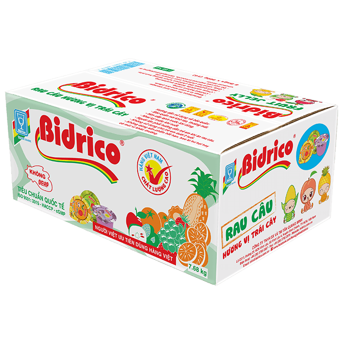 Liên hệRau câu hương vị trái cây Bidrico là sự kết hợp từ bột rau câu, thạch dừa dai dai, giòn giòn và vị chua chua ngọt ngọt từ các loại trái cây: Bắp, chuối, ổi, khóm, xoài, mãng cầu, dừa, cam, dưa… Sự hoà quyện này mang lại một trải nghiệm thú vị và ngon miệng, phù hợp với từng khẩu vị của mọi thành viên trong gia đình.