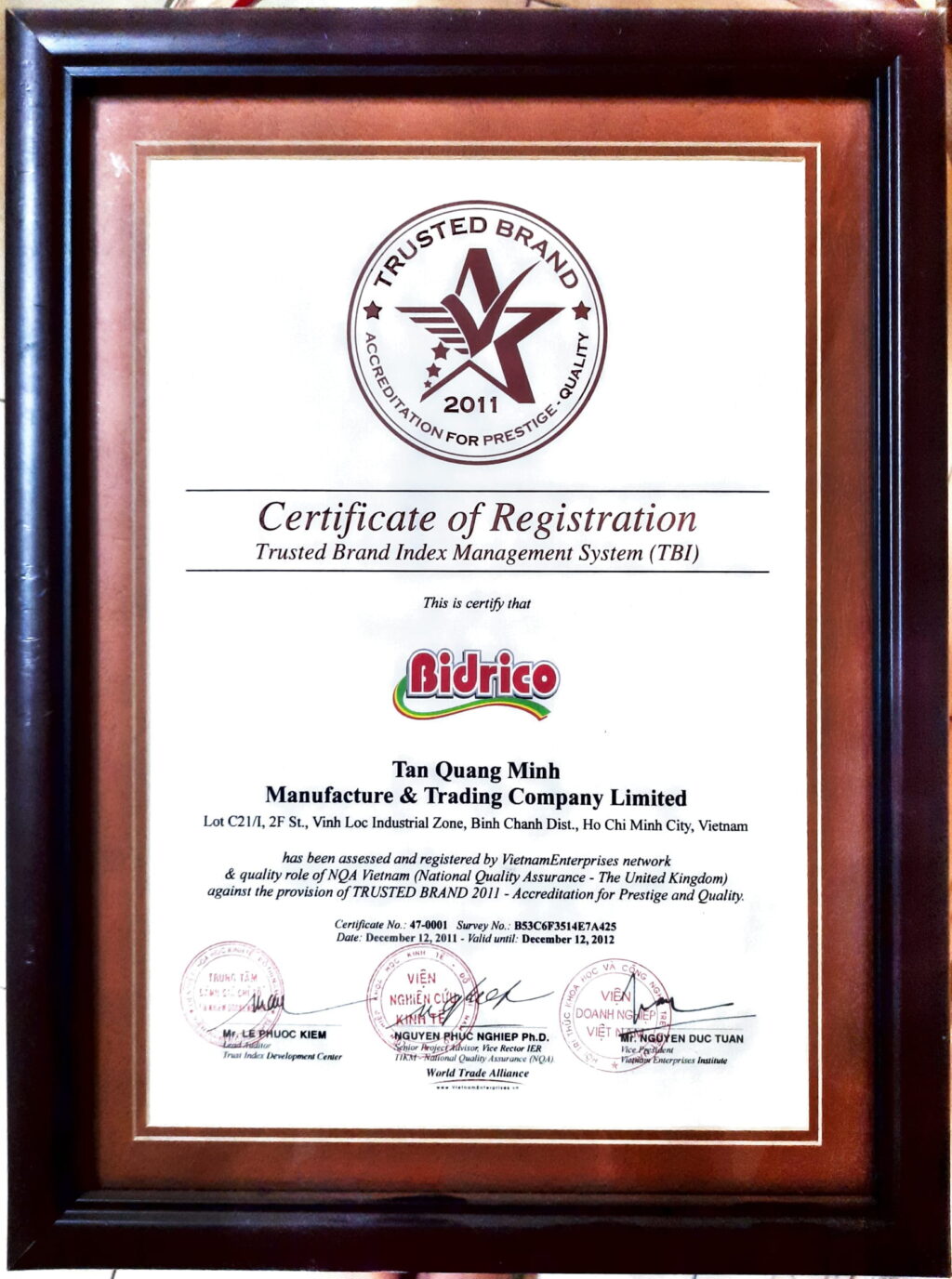 Công ty TNHH SX & TM Tân Quang Minh (Bidrico) nhận “Giải thưởng vàng ngôi sao quốc tế chất lượng dẫn đầu”