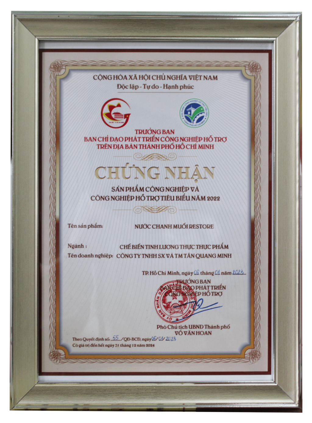 NƯỚC CHANH MUỐI RESTORE ĐƯỢC UBND TP.HCM VINH DANH