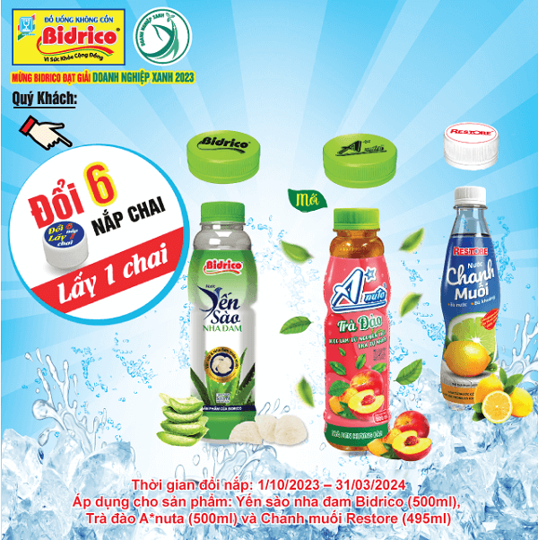 Vinh dự và tự hào khi nhận được giải thưởng “Doanh nghiệp xanh TP.HCM 2023”, Bidrico đang ngày càng nỗ lực để bước vào cuộc đua “Phát thải ròng bằng 0 – Net Zero” của Việt Nam năm 2050. Tiếp nối thành công đạt được, Bidrico triển khai chương trình “Đổi 6 nắp lấy 1...
