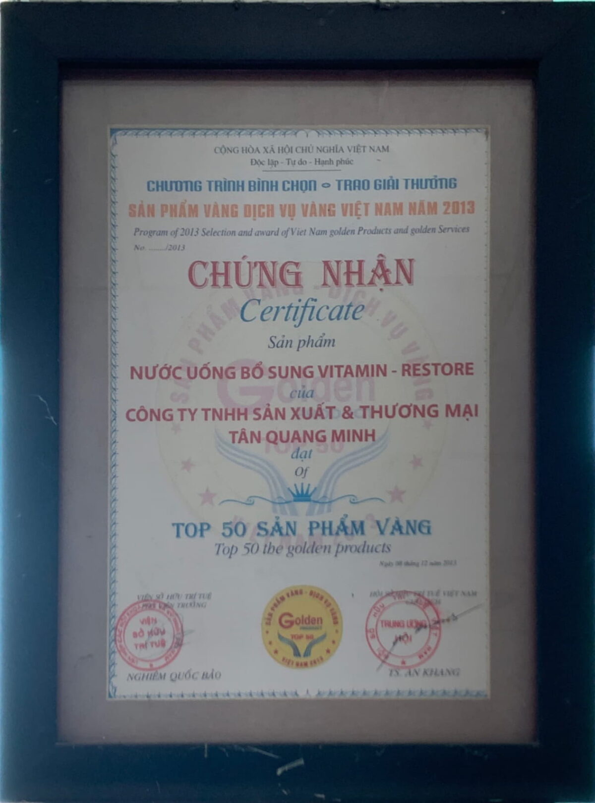 Chứng nhận này một lần nữa khẳng định chất lượng của sản phẩm nước uống Vitamin Restore ngày càng được nhiều người tiêu dùng tín nhiệm và tin dùng. Đây cũng là một vinh dự lớn cho toàn thể lãnh đạo, cán bộ công nhân viên công ty Tân Quang Minh – Bidrico.